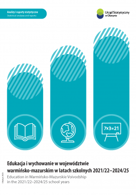 Data presented in this publication concern pre-primary education, primary, post-primary, upper secondary, post-secondary schools, higher education institutions and educational and childcare institutions. The elaboration contains a wide range of information concerning compulsory education, characteristics of education infrastructure and its use, effectiveness of education and social support for youth at schools. It was based on data collected by the Ministry of National Education as part of the Education Information System and the POL-on Integrated System of Information on Higher Education and Science. The publication consists of methodological notes, description of results of surveys and table in Excel form. Methodological notes contain definitions used in the education system. Results of surveys, supplemented with graphs, describe education in the Voivodship in the 2021/22–2024/25 school years. Table part consists of ten thematic sections. The more important data are presented by subregions, powiats and gminas. |